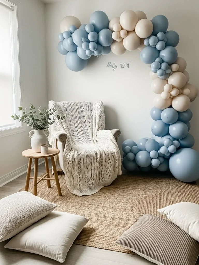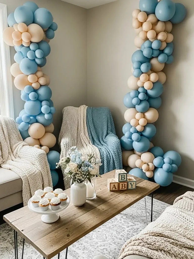 This room design feels like a warm hug the moment you look at it. Soft blue and creamy beige balloon columns frame the seating area in the coziest way without feeling over the top. The neutral walls keep everything calm and airy while the layered textures do the heavy lifting. Chunky knit throws draped over plush armchairs instantly say stay awhile. A simple wooden coffee table grounds the space and adds that homey touch we all love for intimate gatherings. The subtle baby details like the wooden blocks and sweet floral accents keep the focus gentle and welcoming instead of theme heavy.