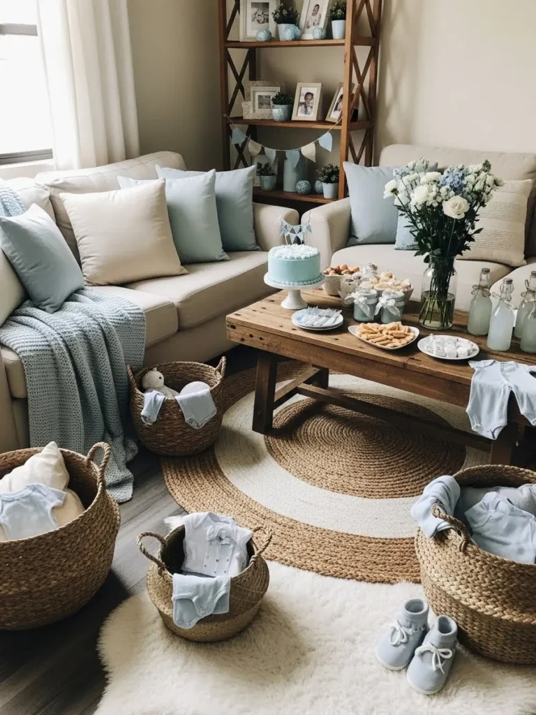 This inviting lounge blends creamy neutrals with gentle pops of soft blue for a baby shower setup that feels calm and homey. The seating is layered with plush pillows and cozy throws, while woven baskets filled with baby essentials double as decor and storage. A simple wooden coffee table holds sweet treats, glass bottles, and a delicate blue cake that quietly sets the theme without overwhelming the space. Natural textures like jute rugs and wicker baskets keep everything grounded and warm.