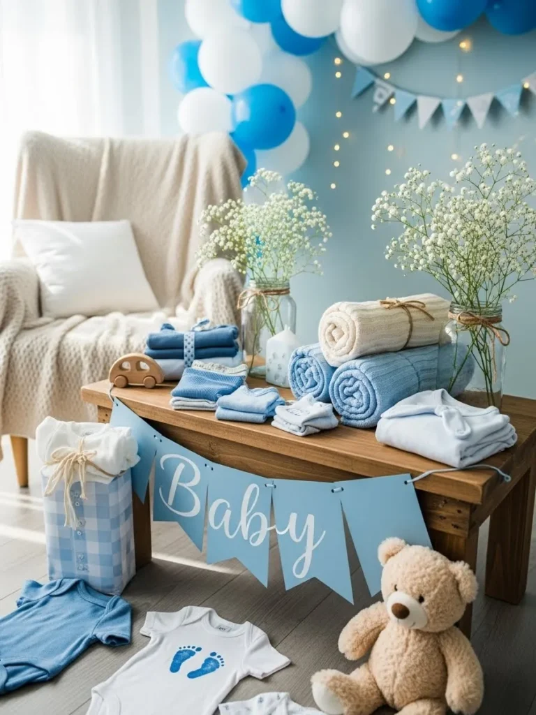 This setup feels like a warm hug the moment you walk into the room. The soft blue and white color palette instantly sets a calm and welcoming mood, while the wooden table grounds everything with a cozy lived in feel. I love how the folded baby clothes and plush towels are neatly displayed like little treasures, paired with simple glass vases filled with delicate white florals. The balloon garland and sweet baby banner add just enough celebration without overpowering the space, and that cuddly teddy bear on the floor makes the whole scene feel playful and heartfelt at the same time.