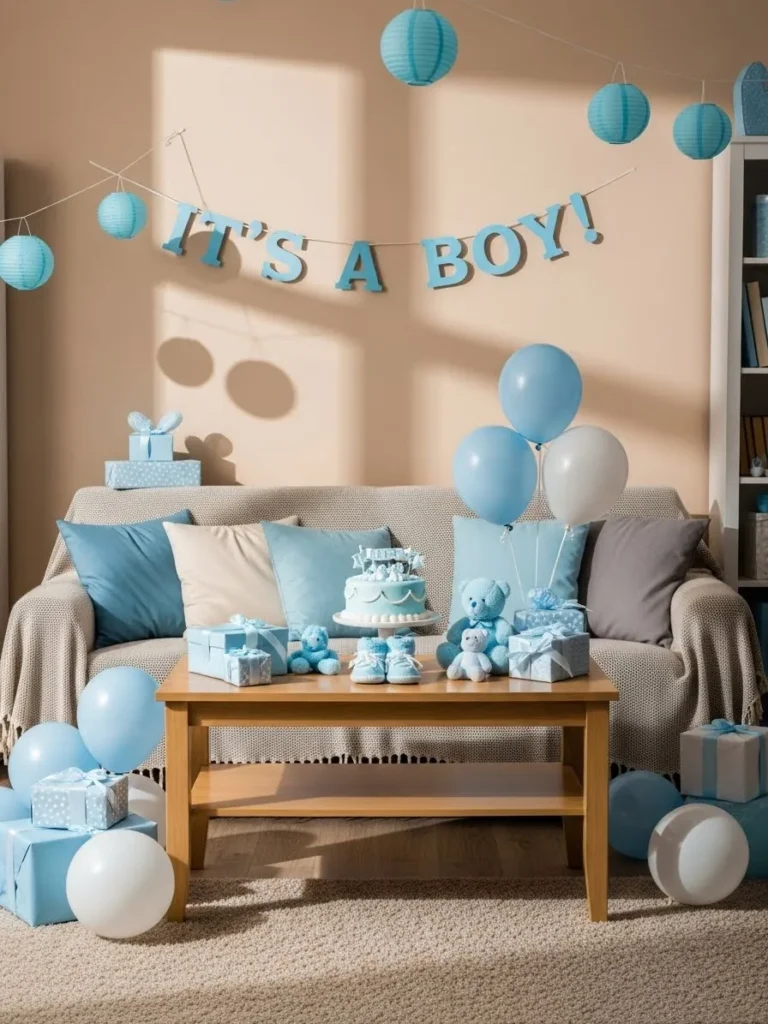 This inviting living room setup leans into soft blue tones and simple styling to create a baby shower space that feels warm and relaxed. Light blue lanterns hang gently above the seating area, while a sweet It’s a Boy banner adds a playful focal point without overwhelming the room. The neutral sofa acts as a calm base, dressed up with pastel pillows, plush teddy bears, and neatly arranged gifts. A wooden coffee table anchors the scene, styled with a delicate cake, baby shoes, and soft decor pieces that make the space feel thoughtfully prepared yet totally comfortable.