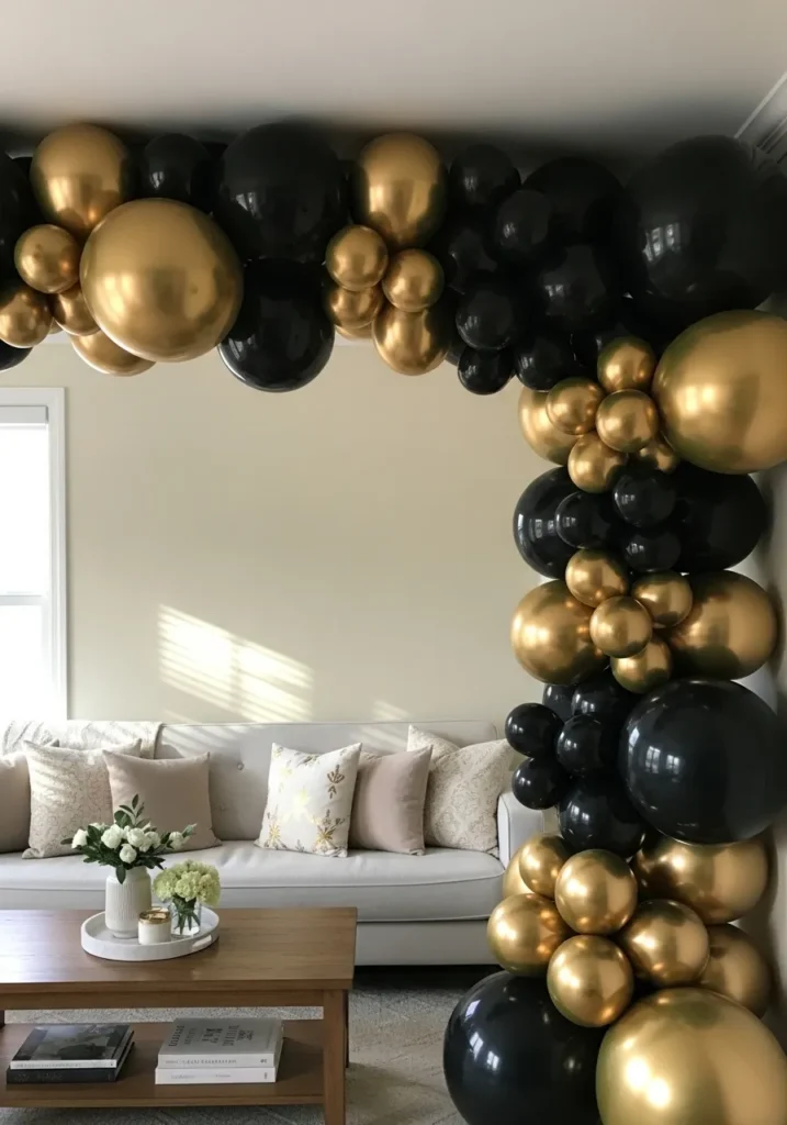 A dramatic balloon arch made of matte black and metallic gold balloons frames a cozy living room corner. The organic shape keeps it modern, while the colors bring in that high end party feel. Natural daylight softens the shine and keeps it grounded.