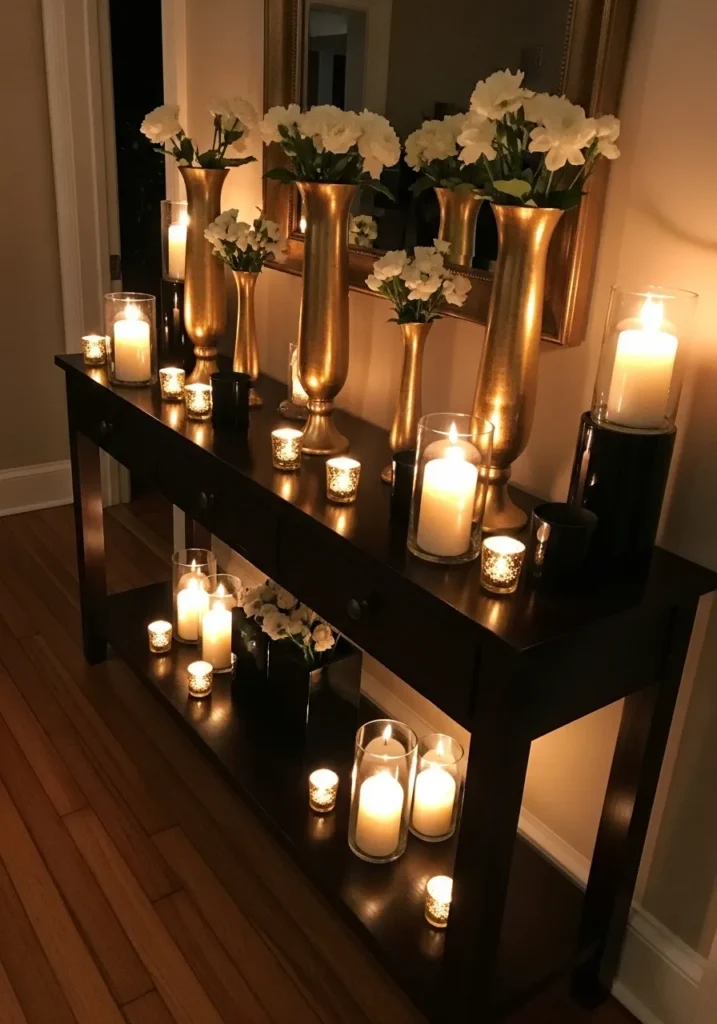 A sleek black sideboard is layered with gold vases, tall candles, and glowing votives placed at different heights. The warm candlelight reflects softly off the surfaces, creating a cozy and intimate mood. The overall look feels rich and calming.