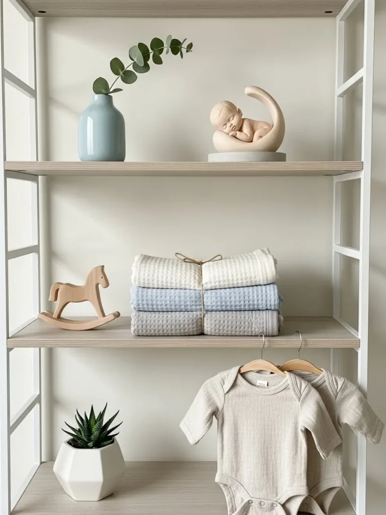 This shelf setup leans fully into calm minimalist vibes with soft neutral tones and simple shapes doing all the work. Light wood shelves paired with a clean white frame keep everything airy and uncluttered. Thoughtful details like folded knit blankets in gentle blue and beige, a tiny wooden rocking horse, and a sculptural sleeping baby figurine add warmth without feeling busy. The muted ceramic vase with greenery brings in just enough life, while the hanging neutral onesies make the space feel intentional and cozy instead of staged.