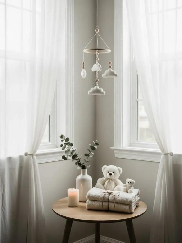 This sweet little setup leans into calm neutral tones with a cozy table tucked between airy white curtains. A simple wooden round table holds folded plush blankets tied with twine, a classic teddy bear duo, and a soft candle glow that instantly warms the space. The hanging cloud mobile above adds a gentle playful touch without feeling busy, and the muted palette of whites, creams, and light wood keeps everything feeling light and peaceful. It feels like a quiet corner designed to slow things down and let the details breathe.