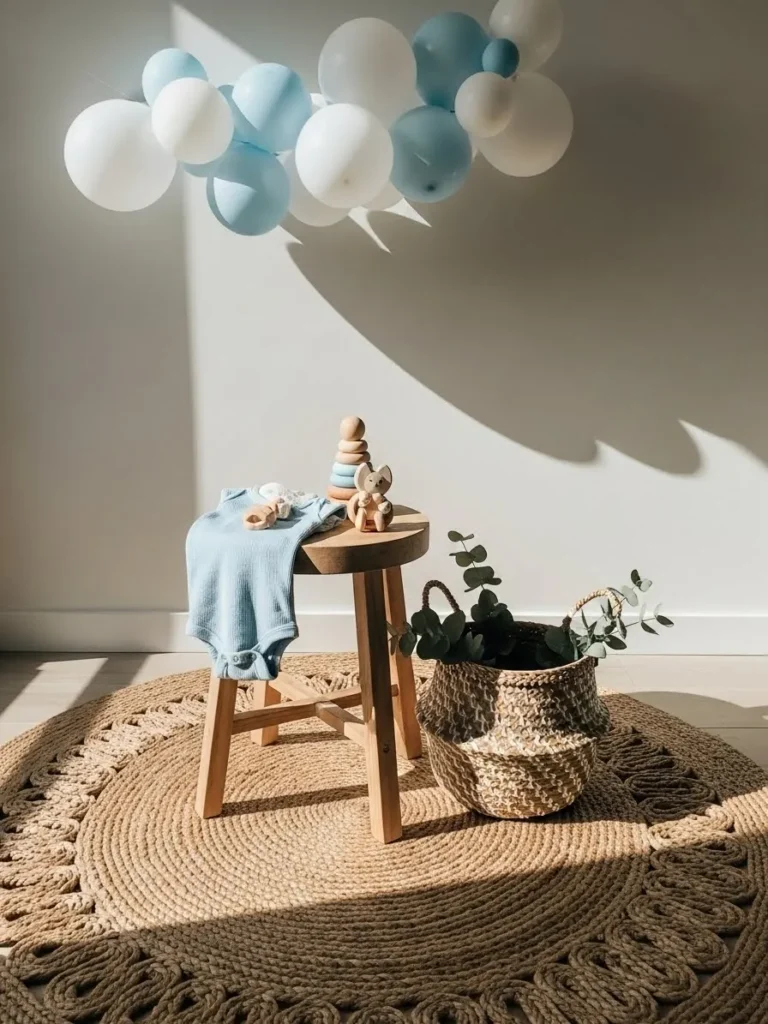 This setup feels light and airy with a simple cluster of soft blue and creamy white balloons floating above a cozy little corner. A small wooden stool acts as a sweet display surface with baby essentials and wooden toys that feel warm and intentional. The woven jute rug grounds the space and adds texture without stealing attention. A natural basket with eucalyptus brings in a touch of greenery that keeps everything fresh and calm. The color palette stays gentle and neutral which makes the whole scene feel relaxed and uncluttered.