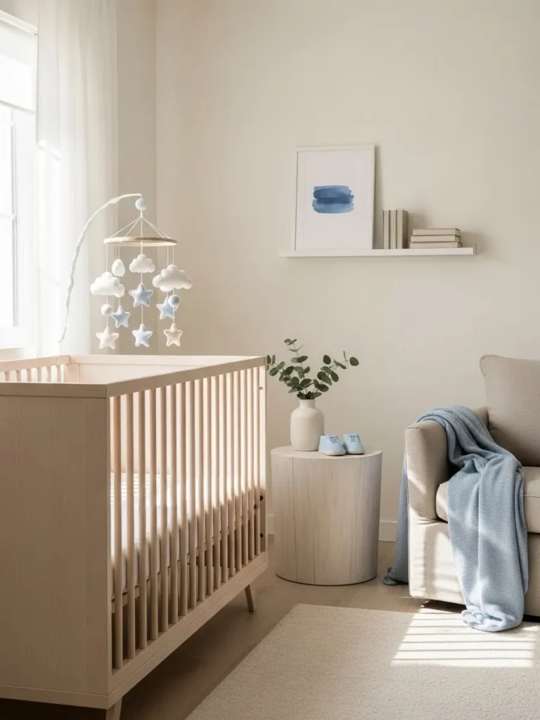 This calm nursery setup leans into light wood furniture and airy neutrals with the softest touch of baby blue.