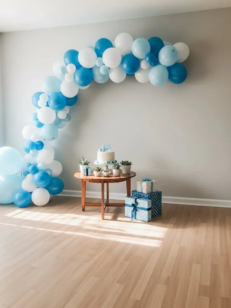 This setup keeps things beautifully simple with a soft blue and white balloon arch gently framing the wall, creating a calm focal point without overwhelming the room. The neutral wall color and light wood flooring let the balloons shine while still feeling airy and uncluttered. A small wooden table sits centered underneath, styled with a minimalist cake and tiny potted plants that add just the right touch of texture. The wrapped gifts in coordinating blue tones feel intentional and tidy, proving you really do not need much to make a space feel styled and special.