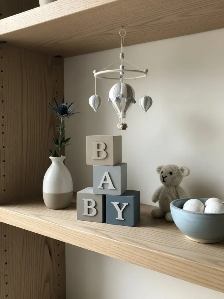 Simple wooden baby blocks and a tiny ceramic vase with greenery bring in that sweet baby shower hint without tipping into theme overload.