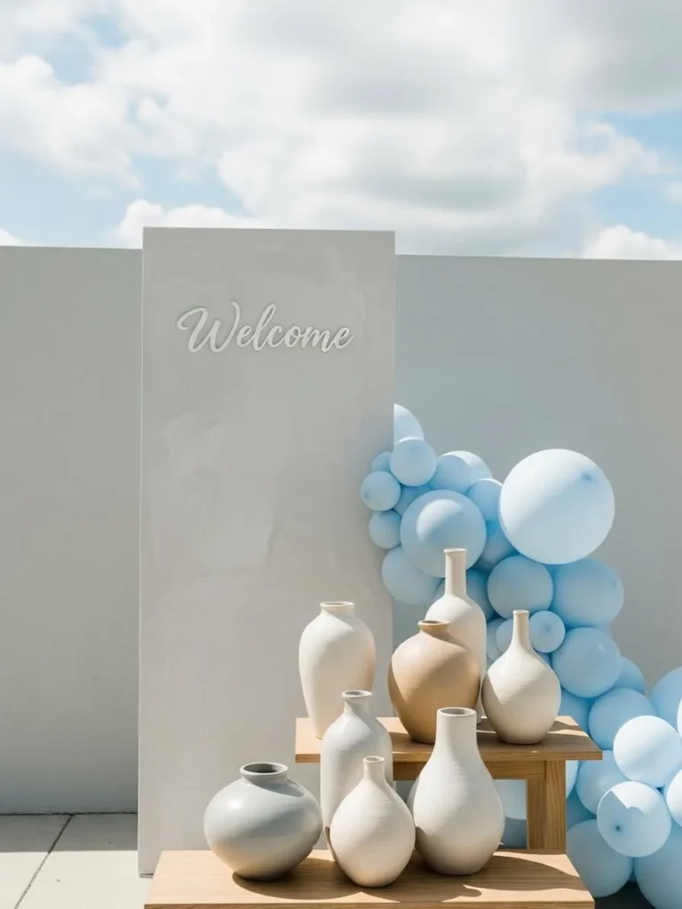 This setup leans into calm and airy styling with a soft blue balloon cluster tucked beside a clean white backdrop and warm wood risers. Neutral ceramic vases in slightly different shapes and finishes add texture without feeling busy, which is exactly what minimalist baby shower decor should do. The muted palette keeps everything feeling gentle and modern, while the simple welcome sign gives the whole space a polished but still relaxed vibe that works beautifully outdoors or inside with good natural light.