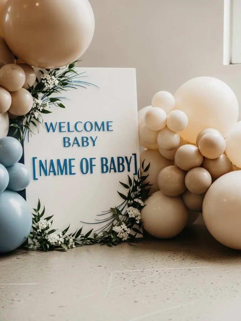 This setup keeps things modern and calm with a soft mix of creamy beige, warm white, and muted blue balloons arranged in an organic cluster. The balloons frame a clean white welcome sign that instantly becomes the focal point without feeling loud or busy. Subtle greenery and tiny white florals add just enough texture to keep the look fresh while still staying minimal. The neutral wall, simple flooring, and balanced spacing make the whole arrangement feel intentional and very on trend for a modern boy baby shower.