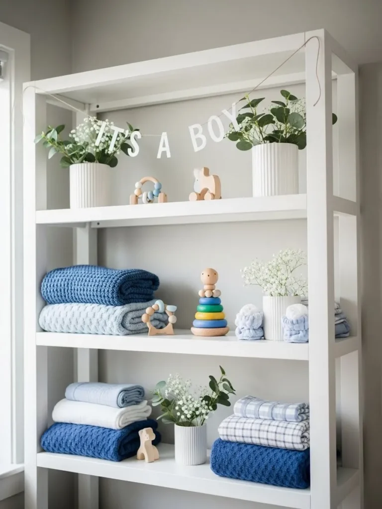 This setup features a clean white open shelving unit styled with soft blue and neutral baby shower decor that feels calm and intentional. Folded knit blankets in shades of dusty blue and white are stacked neatly alongside simple wooden toys and plush accents. Small white vases with fresh greenery add a gentle organic touch while keeping everything light and uncluttered. The overall look is balanced and airy with plenty of breathing room which makes the shelf feel styled but never busy.
