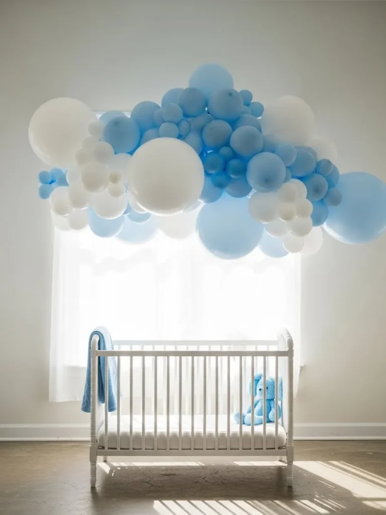 This setup feels airy and calm with a white crib centered under a window dressed in sheer light that makes everything glow. A cloud like balloon garland in soft blue and creamy white floats overhead and frames the space without feeling heavy or busy. The palette stays clean and modern with gentle blues layered in different sizes to add depth while keeping the room peaceful. A simple blue teddy and a folded blanket add just enough sweetness to signal baby without tipping into theme overload.