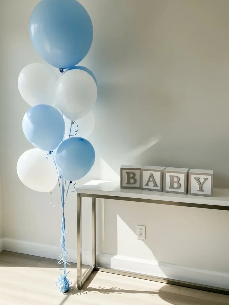This setup features a sleek console table with clean lines set against a soft neutral wall, letting the decor breathe and feel calm. A cluster of pale blue and white balloons floats gently to the side, adding height without overwhelming the space. Simple wooden letter blocks spelling baby sit neatly on the table, keeping the look sweet and intentional. Natural light spills across the floor and wall, giving everything an airy and modern feel that fits perfectly with a clean aesthetic.