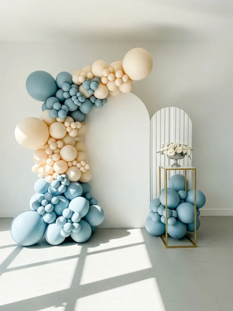 This setup features a beautifully sculptural balloon arch in soft blue and warm cream tones that instantly feels modern and calm. The balloons vary in size which gives the whole display a more organic and intentional look rather than something overly party themed. I love how the arch frames the clean white backdrop and how the matching balloon cluster at the base of the gold stand ties everything together. The minimal color palette keeps it feeling airy while still being playful enough for a baby shower. Natural light bouncing off the matte balloons adds to that fresh and polished aesthetic that looks amazing in photos.