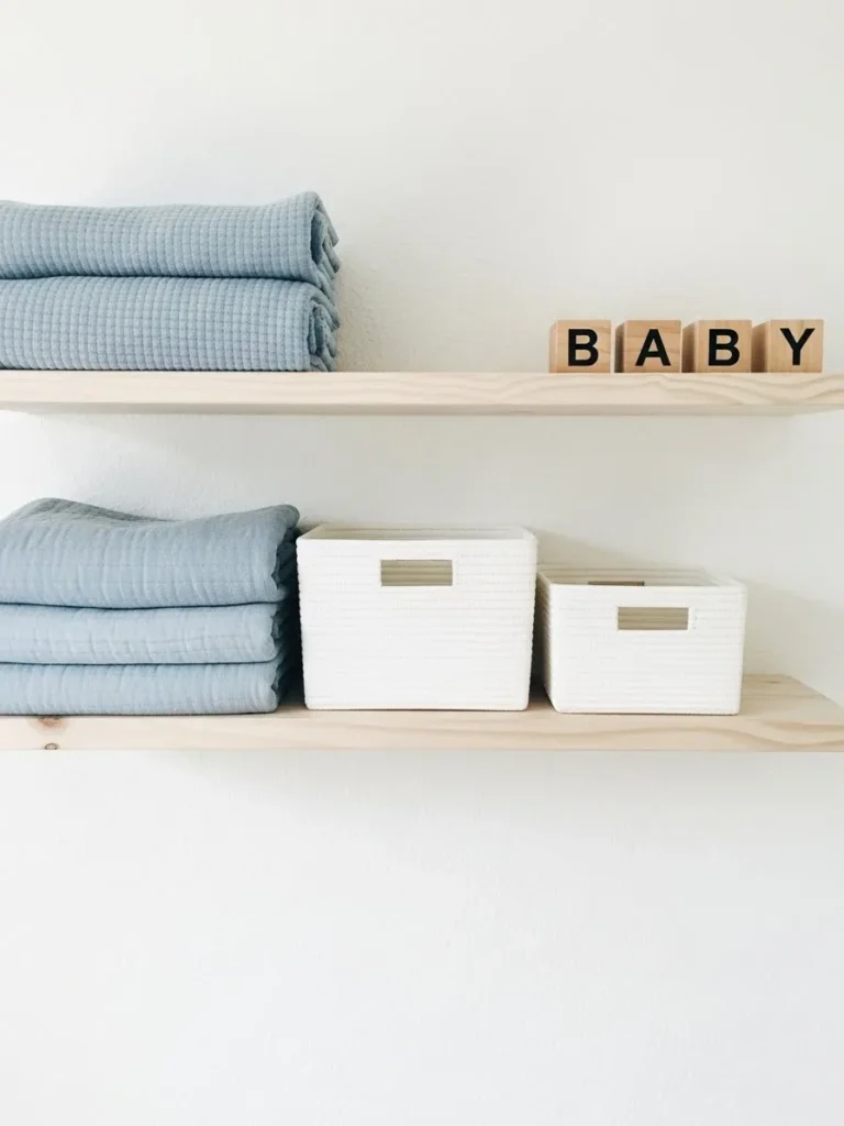 This design keeps things beautifully simple with pale wooden floating shelves styled in the most calming way. Soft blue baby blankets are neatly folded and stacked, bringing in that gentle boy baby vibe without feeling overly themed. White woven storage baskets add texture while keeping everything practical and clutter free. The light wood shelves against a crisp white wall make the whole setup feel airy and intentional, and those small wooden letter blocks spelling baby add just enough sweetness without stealing the show.