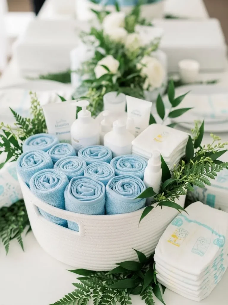 This setup feels calm and thoughtfully styled, with a woven white basket filled with neatly rolled soft blue towels and simple baby care essentials. The palette stays clean and soothing with gentle blues, crisp whites, and fresh greenery woven throughout the table. Everything feels intentional but not overdone, from the minimalist bottles to the leafy accents that soften the look and add a natural touch. It gives that modern baby shower vibe that feels polished, airy, and effortlessly pulled together.