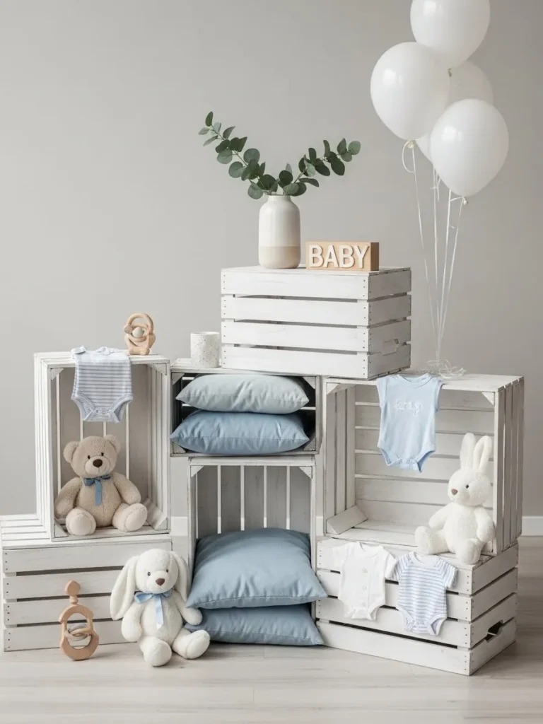 This baby shower setup leans into a clean modern look with stacked white wooden crates acting as display shelves for baby essentials and decor. Soft blue textiles like cushions and onesies add a gentle pop of color without overpowering the space. Plush teddy bears and bunny toys bring in that cozy baby feel while still keeping things styled and intentional. Neutral walls, white balloons, and minimal greenery tie everything together so it feels airy calm and beautifully balanced rather than busy or themed to death.