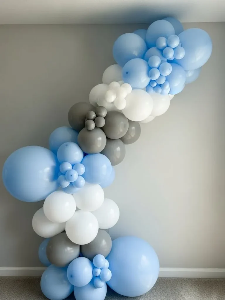 This setup features a sculptural balloon arch flowing up the wall in soft baby blue, creamy white, and gentle gray tones. The balloons vary in size which gives the whole display that organic, designer look instead of anything stiff or overly party themed. Placed against a simple neutral wall, the colors feel calm and intentional, almost like part of the home itself rather than temporary decor. The palette stays clean and airy, making it perfect for a modern boy baby shower that still feels warm and welcoming.