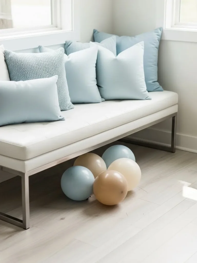 This modern setup features a clean white bench topped with plush pillows in soft blue and airy ivory tones, all tucked neatly beneath bright windows that flood the space with natural light. The lines are simple and minimal, letting the color palette do the talking without feeling over styled. A small cluster of matte balloons in pale blue, warm beige, and creamy white rests casually on the floor, adding a gentle celebratory touch that still feels calm and intentional. The overall look is fresh, modern, and beautifully uncluttered, which makes it perfect for a boy baby shower with a clean aesthetic.