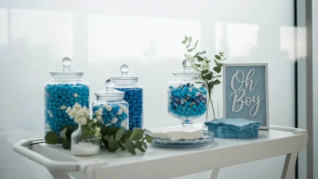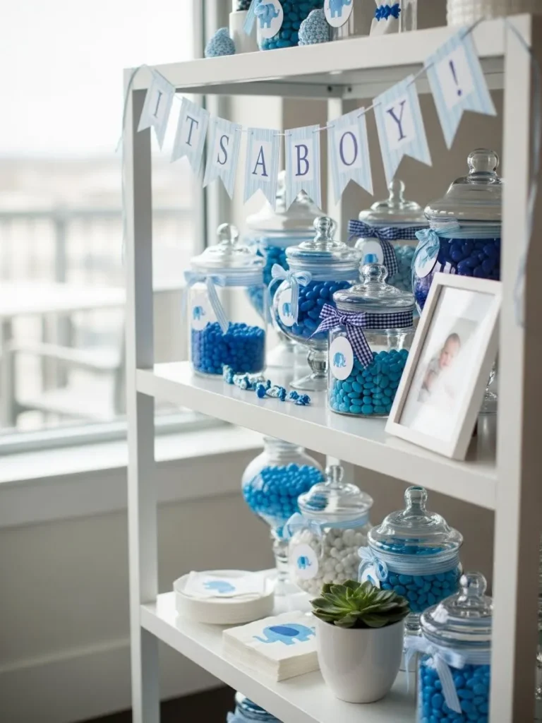 This setup features a crisp white shelving unit styled with clear glass jars filled with soft blue and white candies, all neatly tied with gingham and satin ribbons. The color palette stays calm and modern with powder blue accents, simple elephant motifs, and lots of clean negative space. A delicate banner adds a sweet focal point without overpowering the shelf, while small details like framed baby photos, matching treat containers, and a tiny potted plant keep everything feeling balanced and intentional. The natural light from the window makes the whole display feel airy and fresh rather than overly styled.