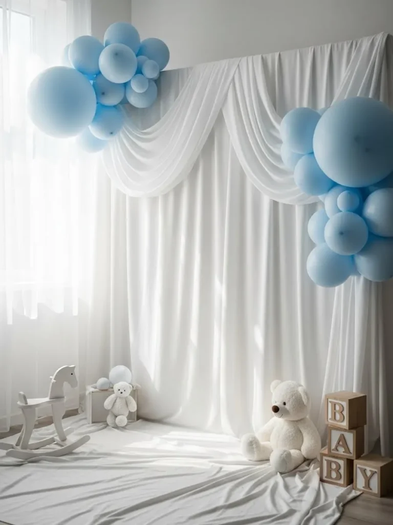 This setup features a clean white fabric backdrop softly draped to create gentle folds that feel airy and calm. Pale blue balloons are clustered in a simple organic shape at the top corners, adding just enough color without overwhelming the space. The floor is kept neutral with a light fabric covering, while classic baby shower touches like plush teddy bears, wooden letter blocks, and a white rocking horse bring in warmth and charm. Natural light filters through sheer curtains, giving everything a soft glow that feels modern and serene rather than overly styled.