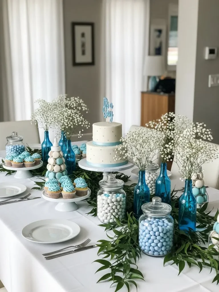 This setup leans into a clean and modern look with soft blue tones layered across the table in a really thoughtful way. The white tablecloth keeps everything feeling crisp while the blue glass bottles add just enough color without overpowering the space. I love how the baby’s breath flowers keep the arrangement light and airy and the greenery runner softens the whole table so it does not feel too formal. The cake sits beautifully at the center with subtle blue details that tie in perfectly with the cupcakes and candy jars. Everything feels coordinated but not overly styled which is such a win for a modern baby shower.
