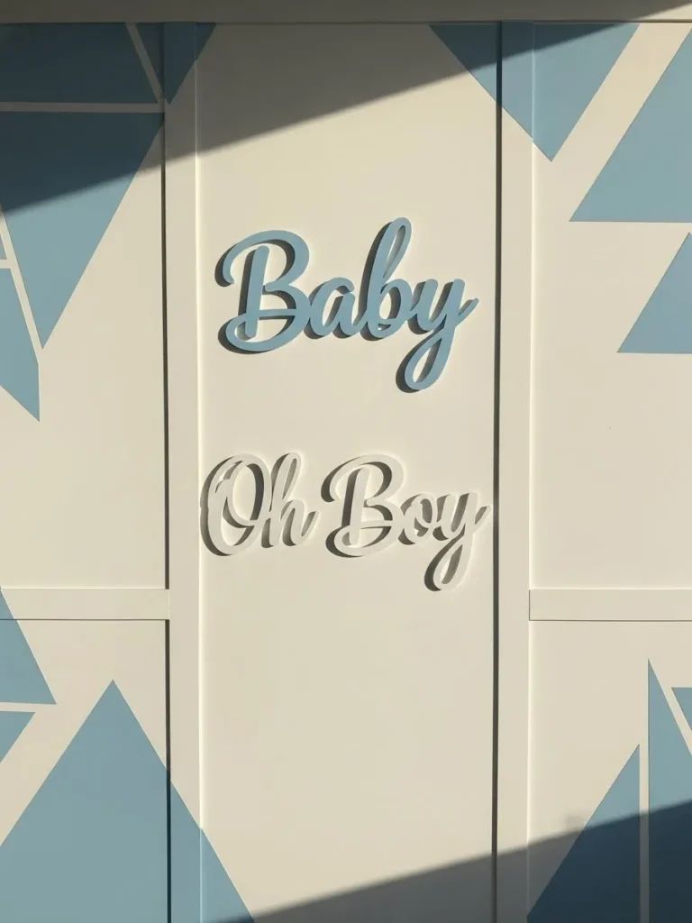 This design features a clean geometric wall backdrop in soft blue and warm white tones that instantly feels modern yet gentle. The repeating triangle pattern adds just enough visual interest without feeling busy, while the muted color palette keeps everything calm and airy. Centered on the wall is a raised script sign that reads Baby Oh Boy in matching soft blue and white which ties the whole look together beautifully. The panel style layout gives it a polished almost architectural feel that works perfectly for a modern baby shower setting.