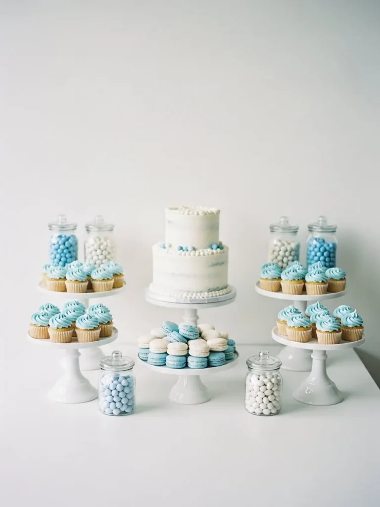 This setup features a beautifully balanced dessert table styled in soft blue and crisp white tones that feel calm and modern at the same time. A simple two tier white cake sits front and center on a classic pedestal stand, surrounded by matching cupcake displays topped with airy blue frosting swirls. Glass jars filled with pastel candies add just the right amount of visual texture while keeping everything clean and uncluttered. The symmetry of the stands and the neutral backdrop make the whole arrangement feel intentional and polished without trying too hard.