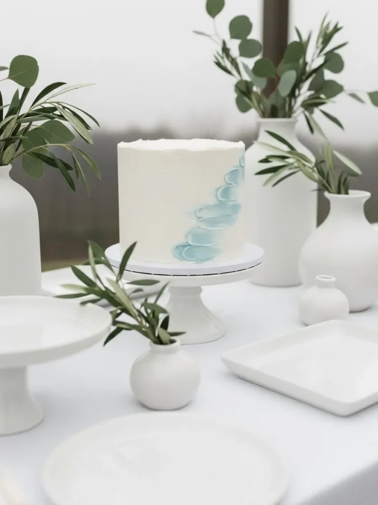 This setup is all about calm simplicity with a modern twist that feels perfect for a boy baby shower. A clean white cake stand takes center stage, topped with a smooth white cake and the subtlest hint of soft blue brush detailing for just enough color. The table is styled with matte white ceramic vases in different shapes, paired with airy greenery that keeps everything fresh and organic. Neutral serving pieces and uncluttered spacing give the whole look a light and breathable feel that still looks thoughtfully styled.