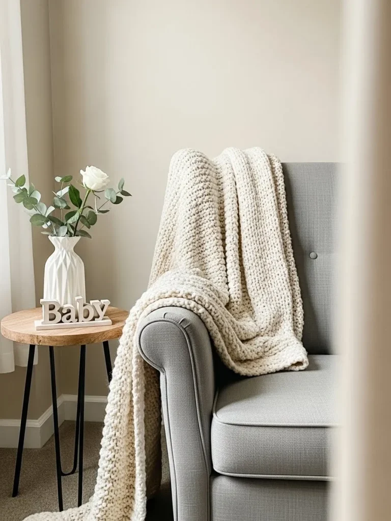 This setup is all about soft textures and calm tones that instantly feel welcoming. A light gray armchair anchors the space while a chunky knit throw in creamy beige adds warmth and that cozy layered look everyone loves right now. The small wooden side table keeps things practical but pretty with its natural finish, topped off with simple baby themed decor and a white vase filled with fresh greenery. The neutral palette feels airy and relaxed, making it perfect for a baby shower moment that feels styled but not overdone.
