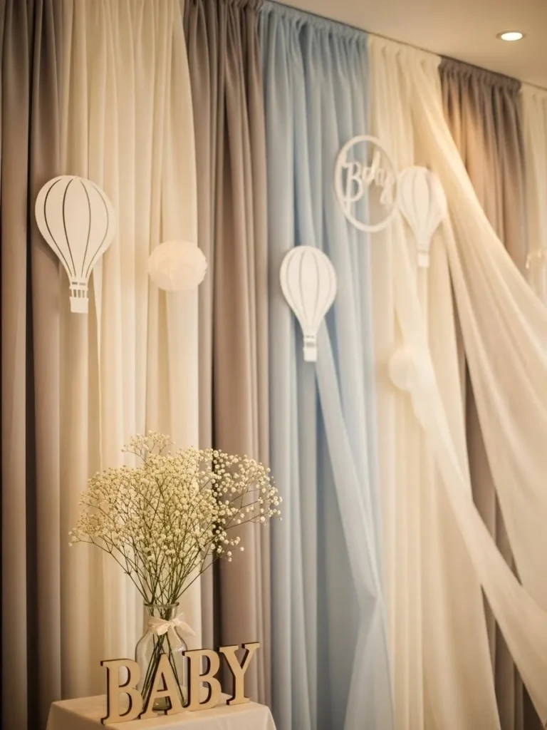 This setup features layered fabric panels in creamy beige soft taupe and gentle baby blue creating a calm and airy backdrop that feels instantly soothing. The draping adds height and movement while the subtle balloon motifs keep it playful without leaning too themed. I love how the neutral palette stays cohesive while still giving just enough contrast to feel styled and intentional. The simple table in front with natural florals and the wooden baby sign grounds the whole look and keeps it warm and welcoming rather than overly polished.