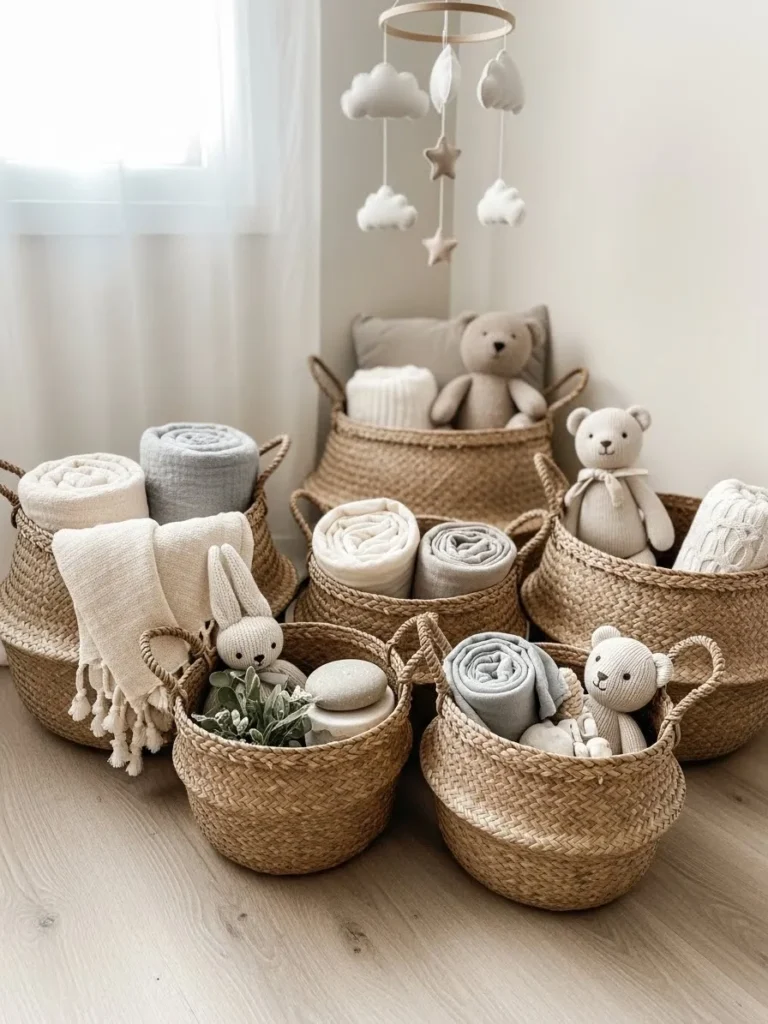 Cozy Neutral Basket Styling for Baby Shower Decor