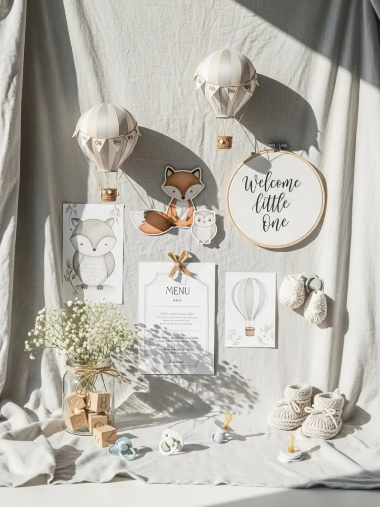 This setup feels like a gentle little storybook moment brought to life with soft neutrals and cozy textures. The fabric backdrop creates an airy base while the hot air balloon accents float effortlessly across the wall in warm whites and muted taupes. Sweet woodland illustrations like the fox and owl add just enough charm without feeling overly themed. Simple paper prints, a round welcome sign, and small handmade touches like knit booties and wooden blocks keep everything calm and cohesive. It all feels thoughtfully styled but still relaxed and approachable.