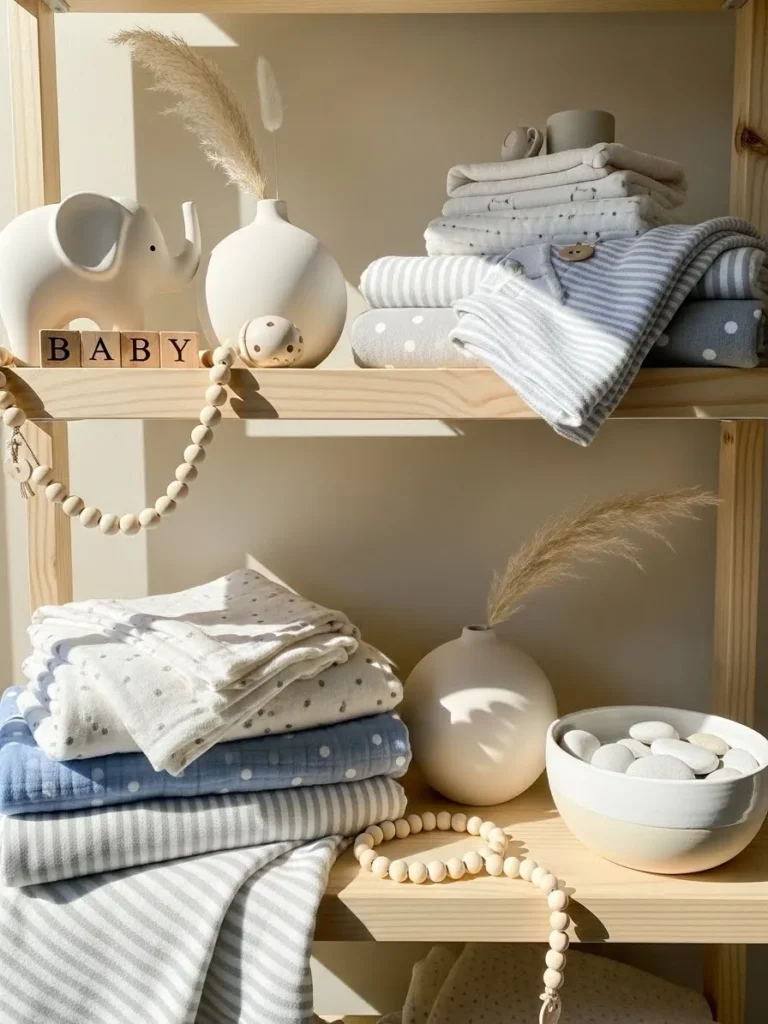 This baby shower setup leans into calm neutral tones with a sweet shelf styled full of cozy textures and simple details. Light wood shelves hold neatly folded baby blankets in soft creams warm grays and muted blues. Ceramic vases with dried grasses add a natural touch while wooden bead garlands and small decor pieces keep everything feeling gentle and playful. The mix of stripes polka dots and smooth ceramics creates interest without feeling busy which makes this perfect for a neutral baby shower that still feels thoughtful and styled.