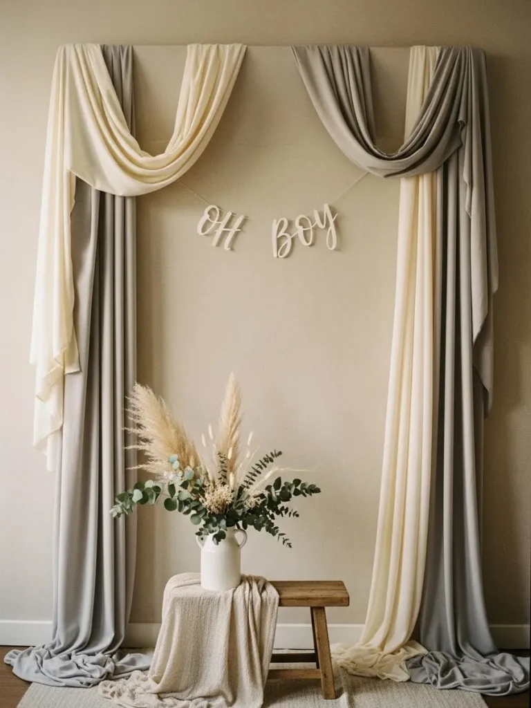 This setup is all about gentle layers and calm tones that instantly set a relaxed mood. Flowing fabric panels in soft cream and warm gray are draped loosely to create a simple backdrop that feels intentional but not overdone. The textures do all the work here. Natural linens cascade to the floor, paired with a wooden bench and a small neutral table topped with dried grasses and eucalyptus. Even the Oh Boy sign blends right in with its soft color and playful shape, making the whole space feel cohesive and soothing without screaming baby theme.
