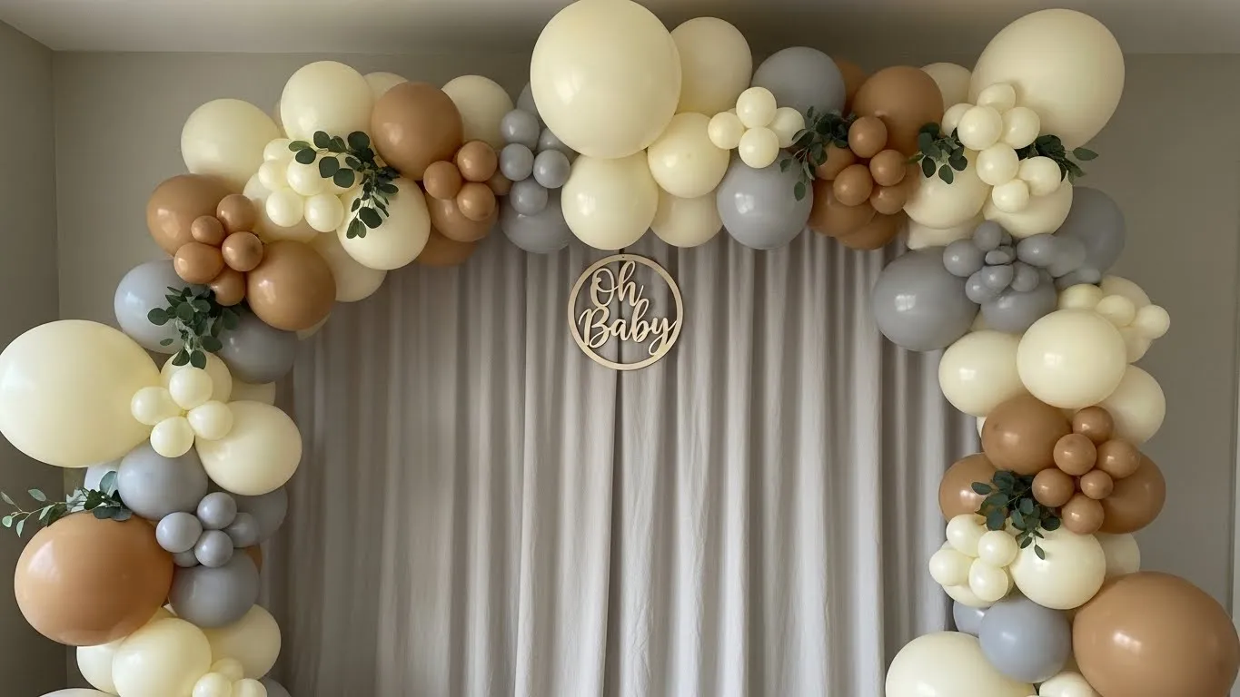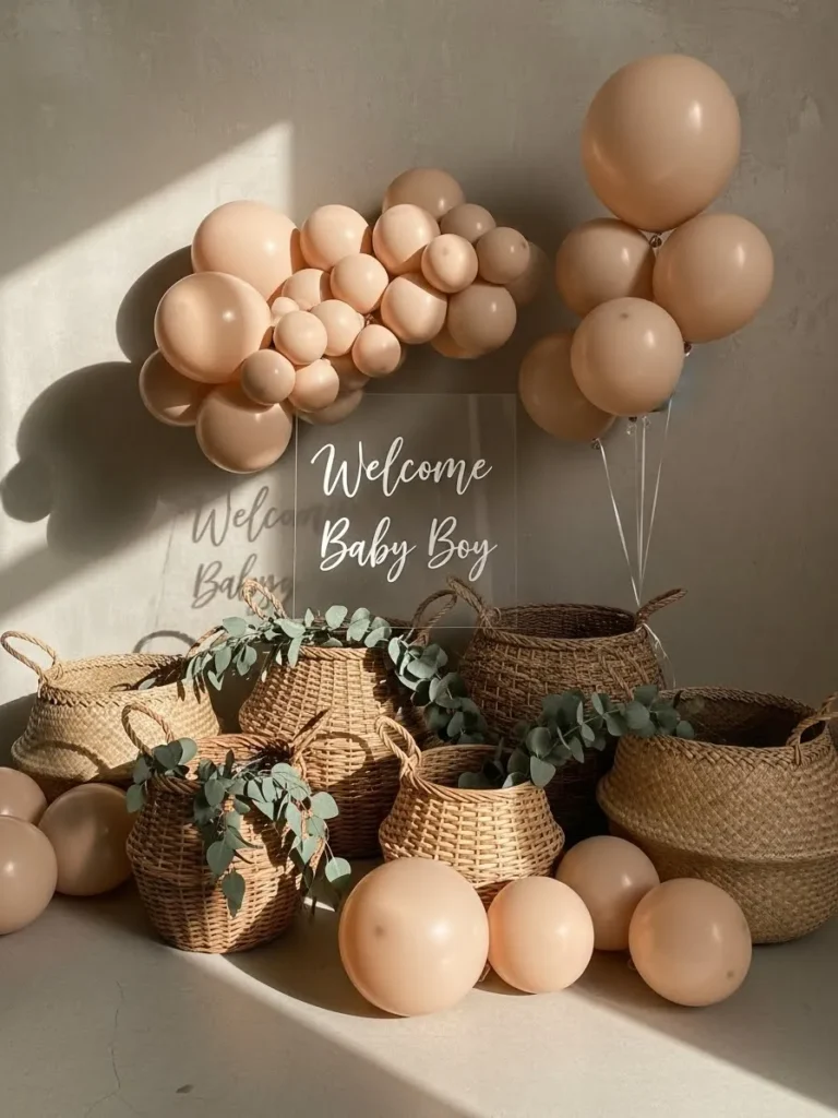 This setup leans into warm neutrals with soft beige balloons, woven baskets, and gentle greenery that instantly make the space feel calm and welcoming. The balloon arrangement keeps things playful but not loud, while the natural textures from the baskets add that cozy home touch everyone loves. I also adore how the light hits the setup and creates soft shadows, because it makes the whole corner feel intentional without trying too hard. It is simple, airy, and perfect for a baby shower that wants to feel stylish but still relaxed.