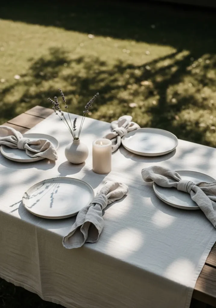 This dining table uses crisp white surfaces and a lush green centerpiece to create a fresh, uplifting look. Stacked plates and neatly folded napkins keep things organized while still feeling relaxed and inviting. It’s a great option for indoor celebrations that want a clean, airy vibe.