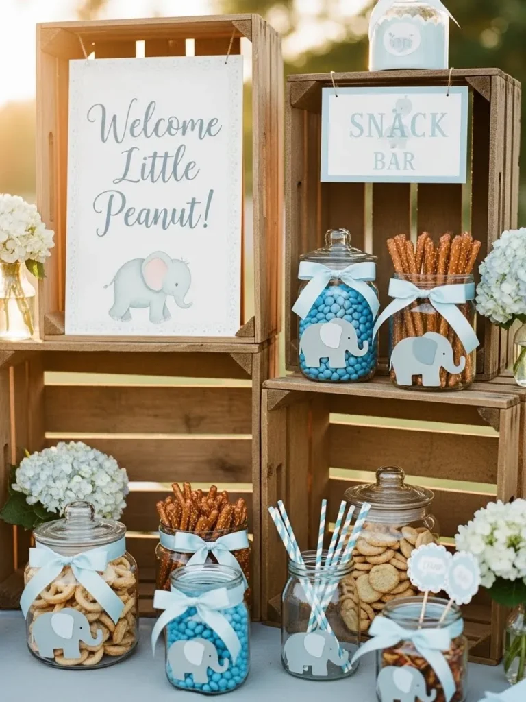 This setup features a charming snack table styled with stacked wooden crates that instantly give it that cozy homey feel. Clear glass jars filled with blue candies, pretzels, cookies, and snacks are tied with soft blue ribbons and finished with adorable little elephant tags. The muted blue and white palette feels calm and gentle, while the wooden crates add warmth and texture that balance everything out. A simple welcome sign with a baby elephant illustration pulls the whole look together and makes the table feel intentional instead of cluttered.