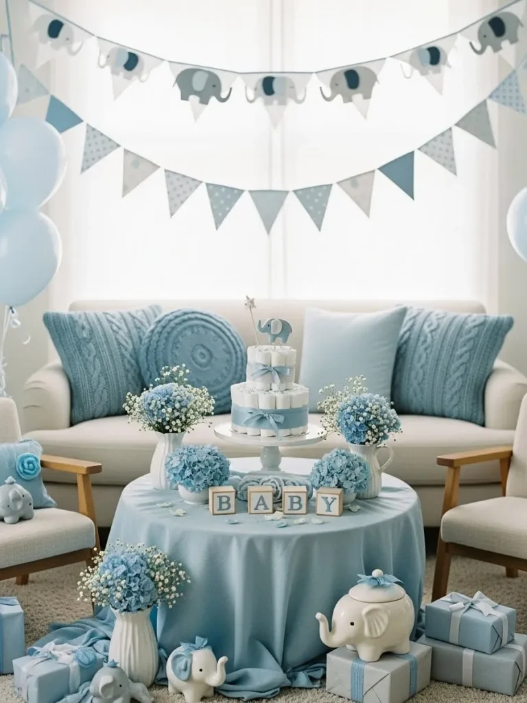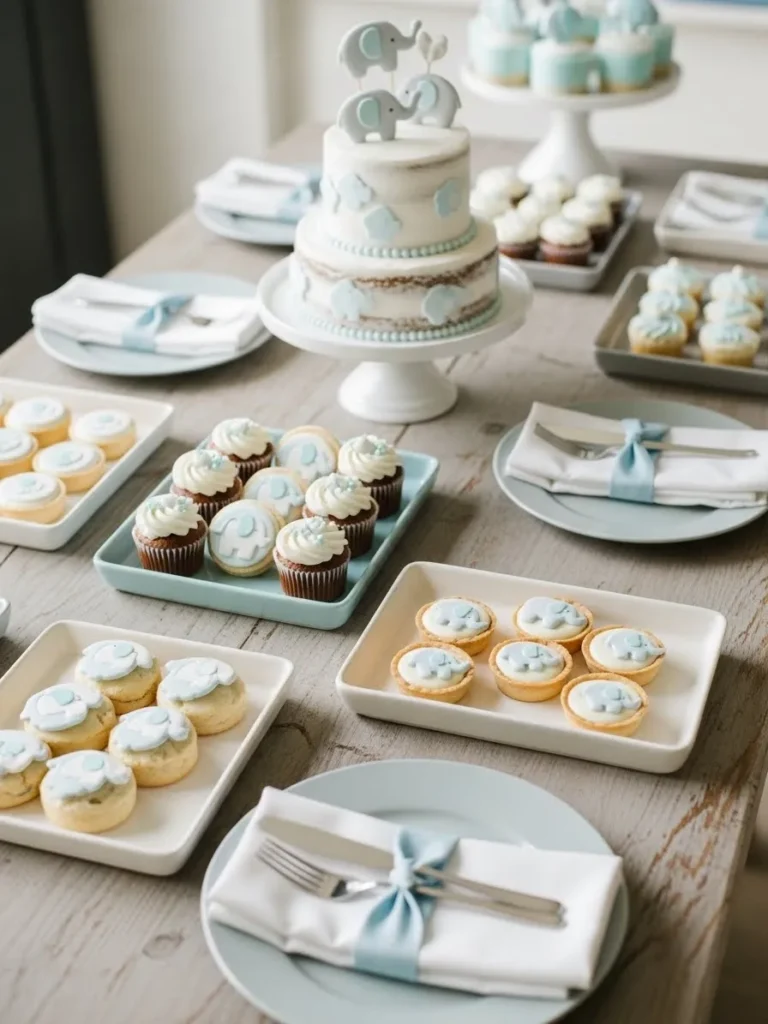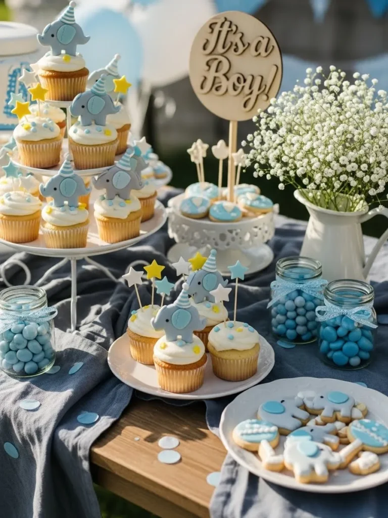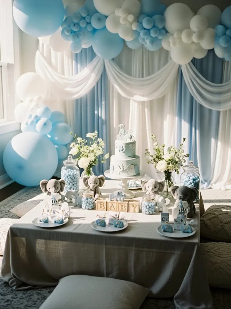 I honestly love how charming this setup feels without trying too hard. It reminds me of those baby showers where everyone actually wants to sit and linger because the table feels welcoming and calm. The elephants add personality without screaming for attention, and the soft blue makes everything feel gentle and boyish in the best way. If I were hosting, this is the kind of table I would be proud to photograph from every angle and secretly hope guests hesitate before disturbing it.
