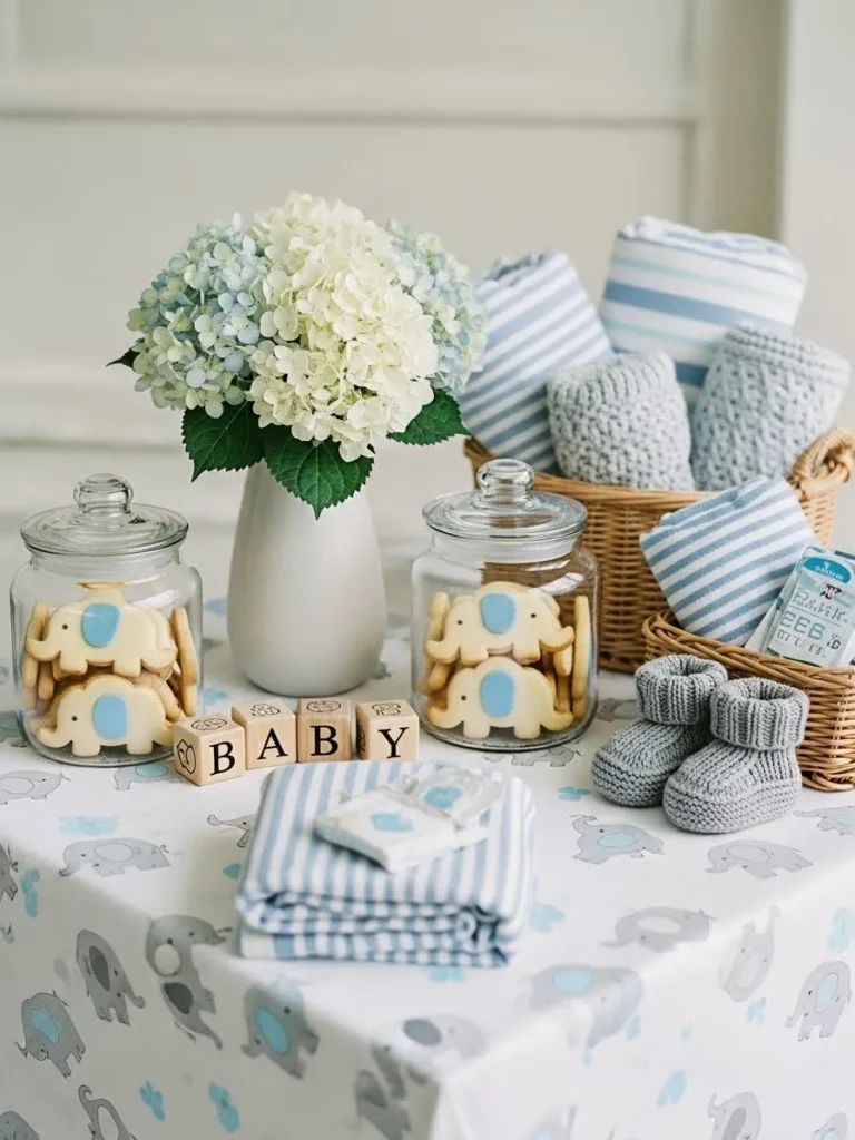 This sweet little setup feels calm and cozy with its soft blue and white color palette and the cutest elephant details sprinkled everywhere. Glass jars filled with elephant cookies double as decor and treats which I always love for baby showers. The table is layered with a gentle elephant print tablecloth, folded striped linens, knitted booties, and woven baskets that add texture without feeling busy. A simple vase of hydrangeas keeps the whole look fresh and airy while still feeling polished and intentional.