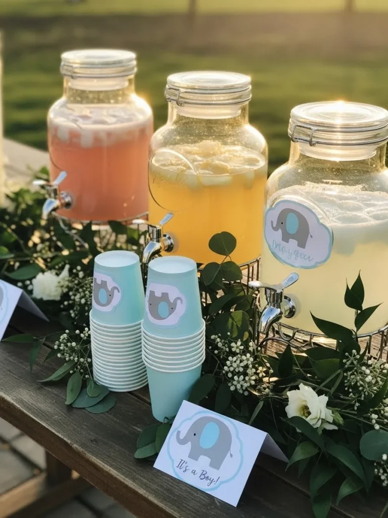 This sweet little drink station is all about gentle colors and playful details that feel perfect for a baby boy celebration. The glass drink dispensers lined up on a rustic wooden table instantly create that cozy outdoor vibe, while the soft pastel drinks add a light and cheerful touch. I love how the elephant labels tie everything together without feeling overdone, and those minty blue paper cups are just the right pop of color. The greenery and white florals woven around the setup soften the look even more, making it feel fresh, welcoming, and very Pinterest friendly.