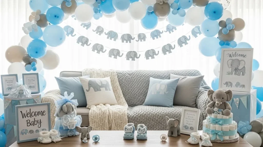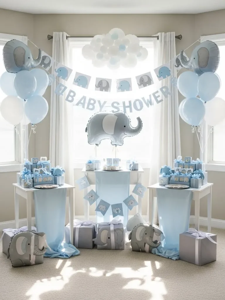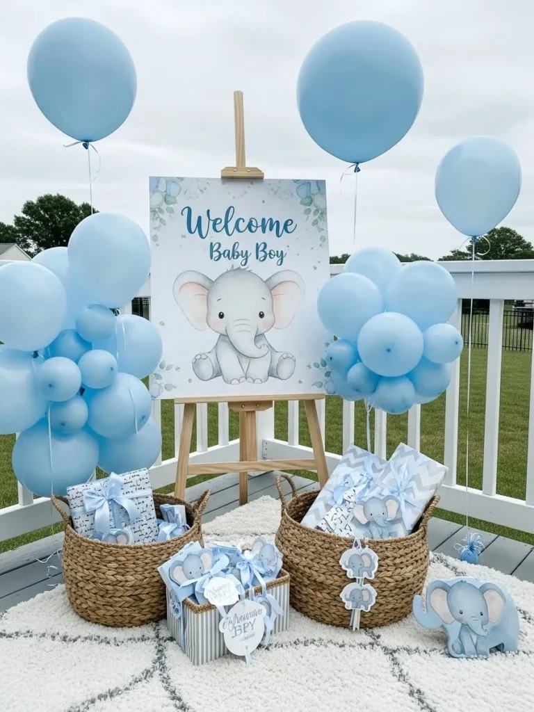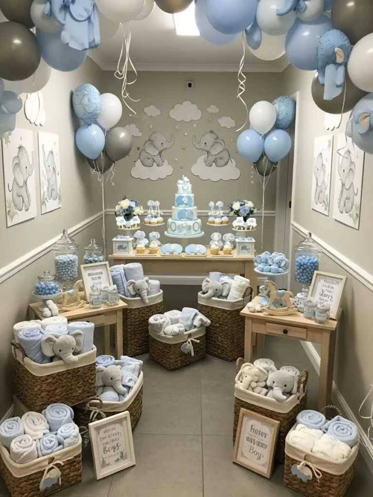 I honestly love how gentle this looks without feeling boring. It has that sweet baby shower magic without going over the top. The elephant theme feels warm and joyful and the soft color palette makes everything feel calm and welcoming. If I were hosting a baby shower for a little boy this would be one of those setups I would stare at all afternoon because it just feels happy and heartfelt.