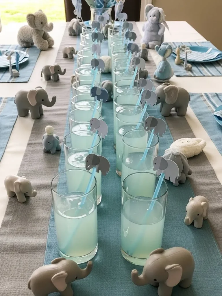 This table setup leans into a calm soft blue palette with gentle gray tones that instantly feel soothing and playful at the same time. Clear glasses filled with a pale blue drink run neatly down the center on a simple fabric runner, each one topped with tiny elephant drink tags and matching straws. Small elephant figurines and plush accents are placed all around the table, creating a sweet sense of movement without feeling cluttered. Everything feels balanced and intentional, from the soft textures to the muted colors that keep the look light and airy rather than overly themed.