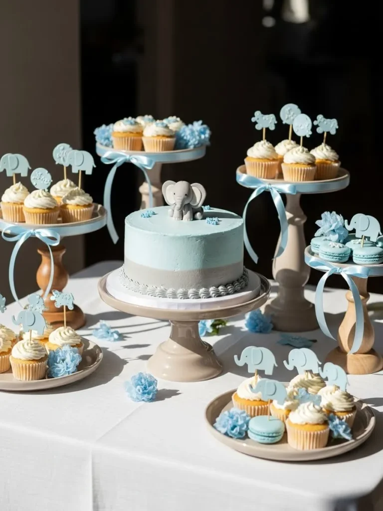 This setup feels like a dreamy little corner made just for celebrating, with soft blue tones layered in the sweetest way. The dessert table features a simple pastel cake topped with a tiny elephant figure that instantly steals the show. Cupcakes and macarons sit on neutral pedestal stands tied with pale blue ribbons, giving everything a calm and cohesive look. The elephant toppers add playful charm without feeling loud, and the mix of textures from frosting swirls to delicate florals keeps the table visually interesting while still feeling light and airy.