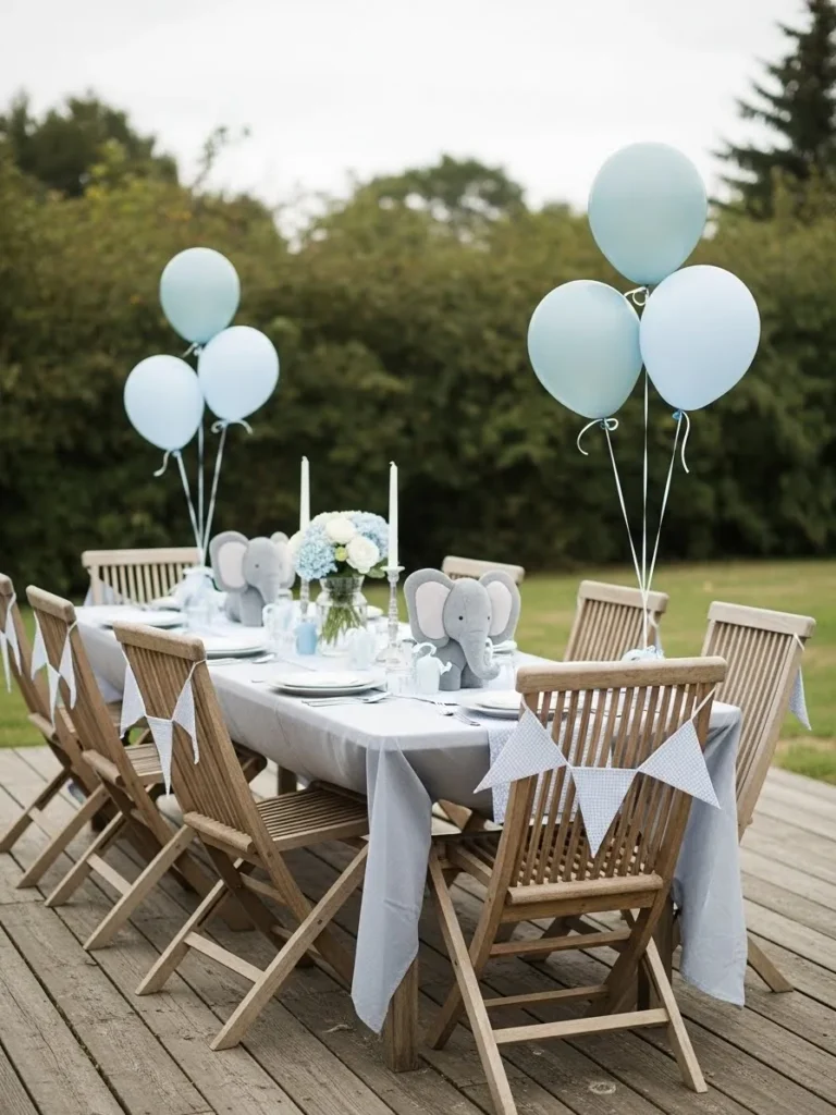 This setup feels like the sweetest outdoor baby shower moment with a soft blue and white color palette that instantly feels calm and playful. The wooden table and chairs give it that relaxed garden vibe, while the pale tablecloth keeps everything light and airy. Cute elephant details sit right at each place setting, paired with soft blue balloons that float gently above the table. The simple bunting and fresh floral centerpiece add just enough charm without making the table feel crowded or fussy.