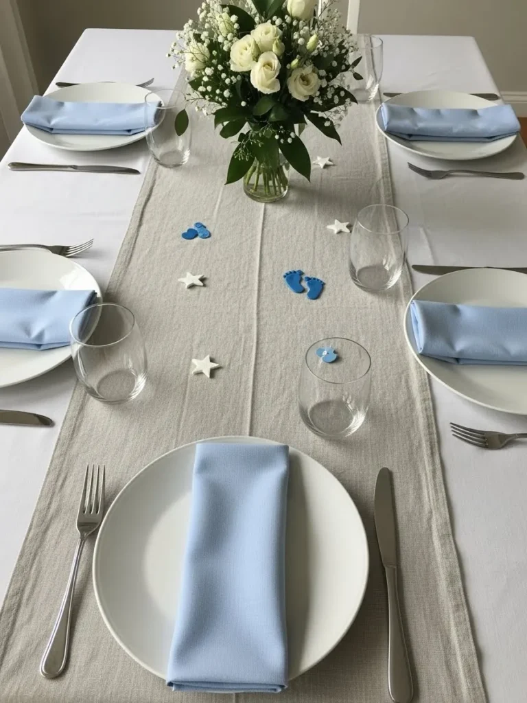 This table setup keeps things clean and calm with a soft neutral runner layered over a crisp white tablecloth. Pale blue cloth napkins are neatly folded on white plates which instantly signals a baby boy theme without feeling loud or themed. Clear glassware and simple silver cutlery keep everything feeling light and uncluttered. The centerpiece of white florals adds a fresh touch while small blue baby feet and star details sprinkled along the runner bring in just enough playful charm.