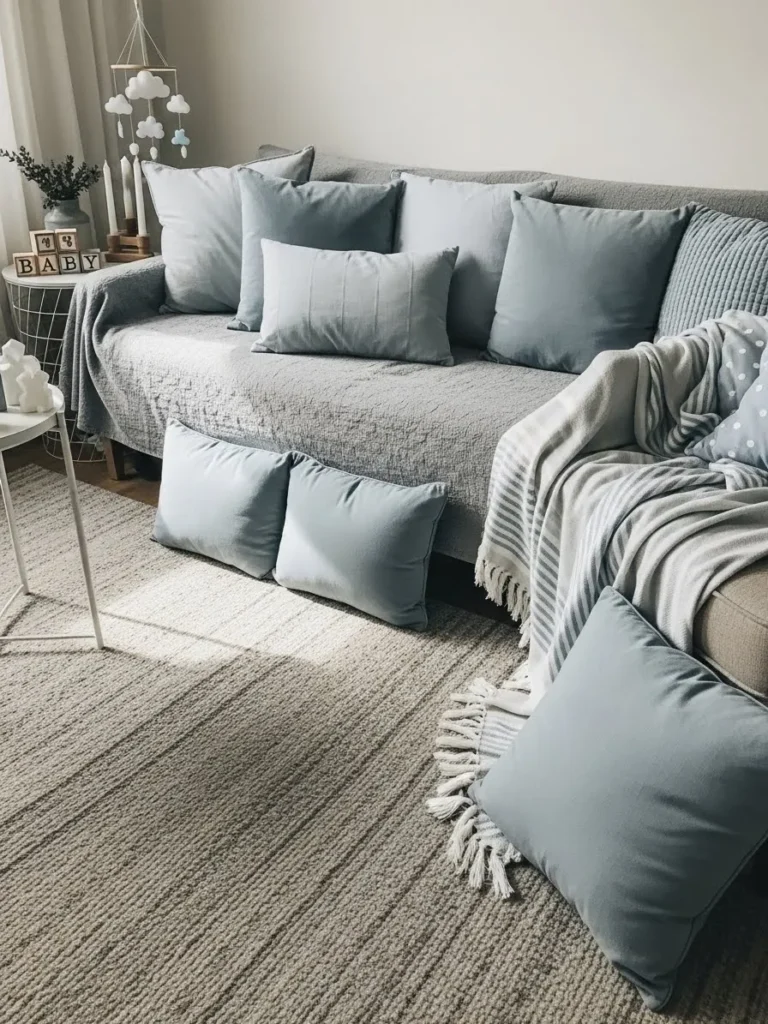 This soft blue lounge setup feels calm and welcoming without trying too hard. The neutral sofa is dressed in layers of powdery blue and misty gray pillows that instantly read sweet but still grown up. A textured throw drapes casually over the arm which adds that lived in comfort everyone loves. Subtle baby shower touches like the cloud mobile and wooden baby blocks blend right into the space instead of screaming theme. The neutral rug grounds everything and keeps the look relaxed and airy which is perfect for a boy baby shower that leans minimalist and cozy.