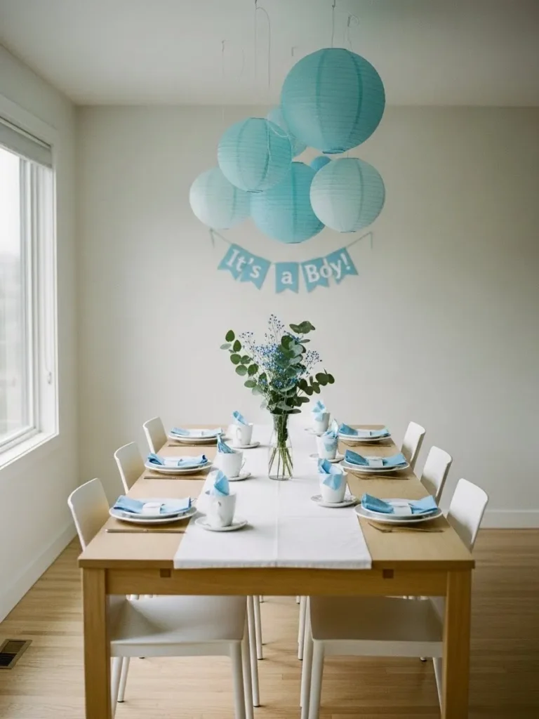 This setup keeps things calm and charming with a simple wooden dining table dressed in a crisp white runner and soft blue accents throughout. The place settings feel neat and intentional with white plates, matching cups, and folded blue napkins that add just enough color without stealing the show. Hanging above the table, the cluster of blue and white paper lanterns creates a light airy focal point, while the small Its a Boy banner adds a sweet celebratory touch without overwhelming the space. Fresh greenery in a clear glass vase finishes the look in a way that feels natural and unfussy.