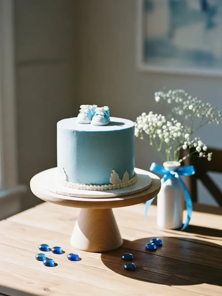 This setup keeps things refreshingly simple with a single soft blue cake as the star of the table. The cake sits on a natural wooden stand that adds warmth without stealing attention, while tiny baby blue shoes on top give it that sweet boy baby shower touch. The surrounding space feels calm and airy with gentle daylight, clean surfaces, and just a hint of decor from scattered blue glass accents and a small vase of white florals tied with a ribbon. Nothing feels crowded or overdone, which is exactly what makes it work so well.