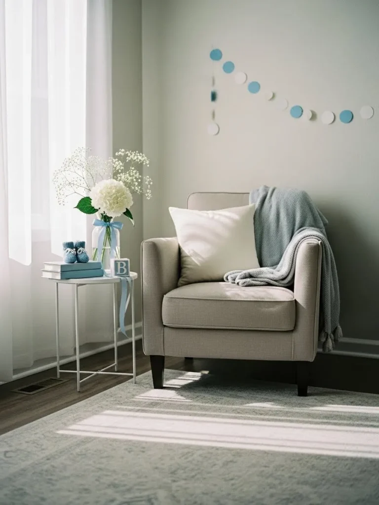 This setup feels calm and thoughtfully styled with a cozy upholstered armchair placed near a bright window, letting soft daylight do most of the work. The neutral tones of the chair and rug are gently layered with light blue accents like the throw blanket and delicate wall garland, which adds a subtle baby shower touch without feeling themed or overdone. A small side table holds simple decor with a vase of white florals, baby booties, and stacked books, creating a sweet but uncluttered moment that feels intentional and airy.